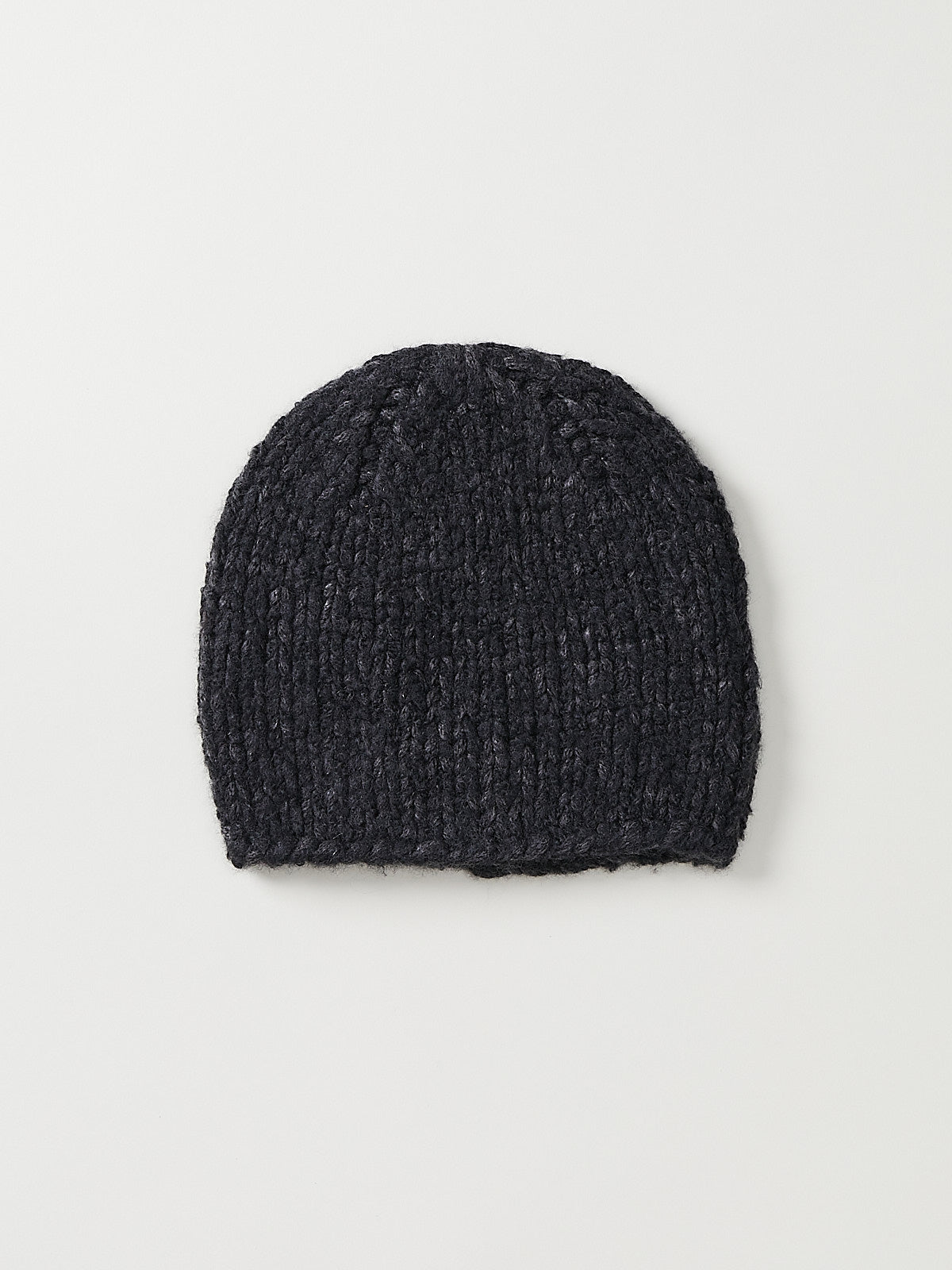 Handknitted beanie in grey two-toned cashmere/silk. Braid detail at the bottom hem.