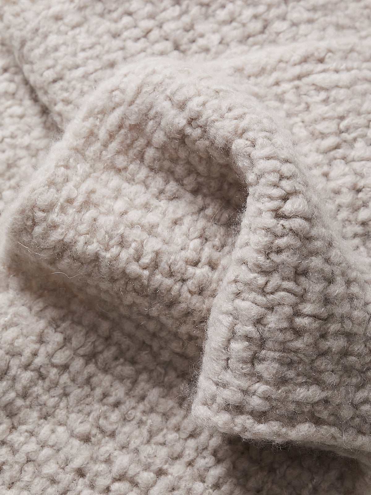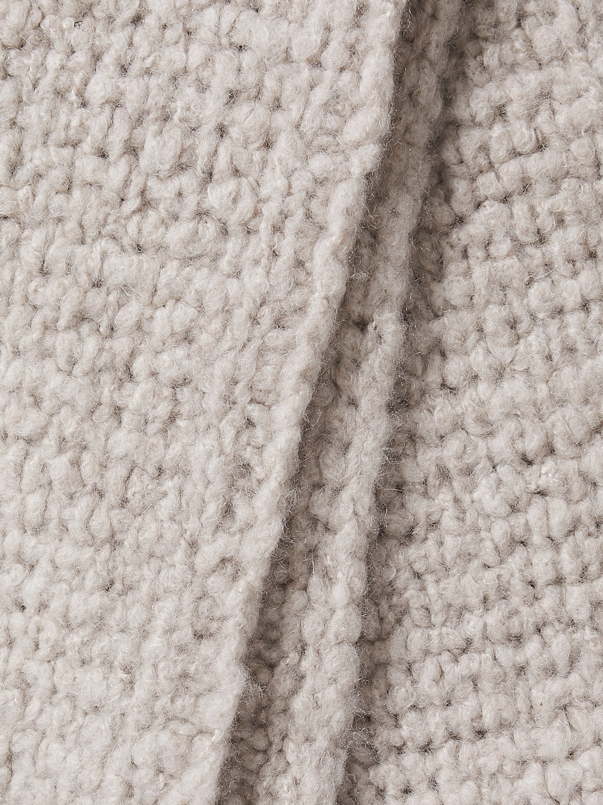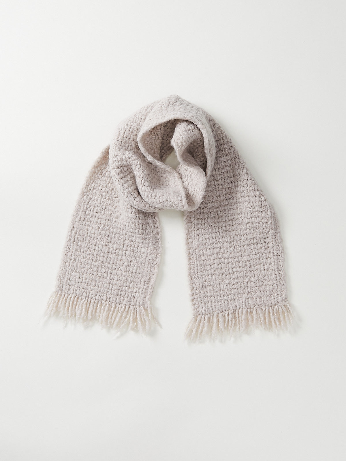 Handknitted scarf in off white cashmere/silk. Features a fringed edge.
