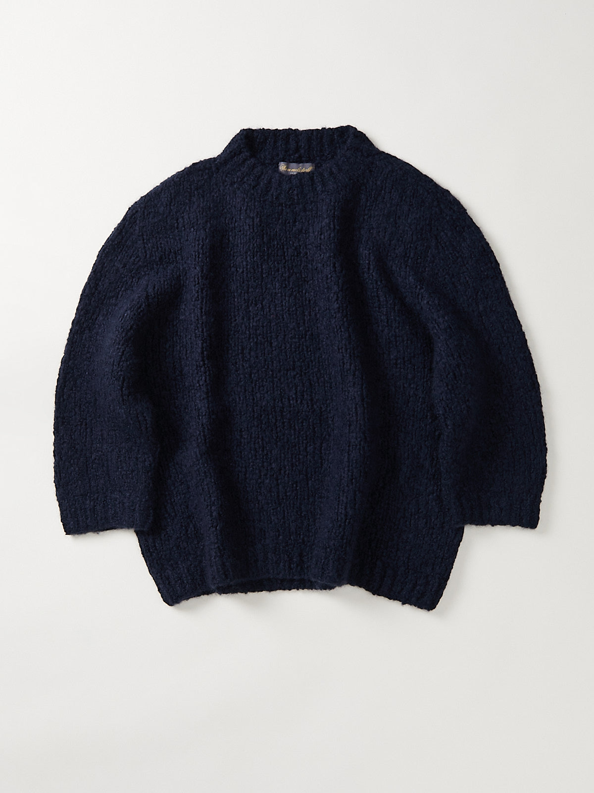 Handknitted sweater in dark blue mid-weight cashmere/silk. High crewneck and 3/4 sleeves with a fully fashioned shoulder. Rib detail around the neck, cuffs and bottom hem. Regular fit.