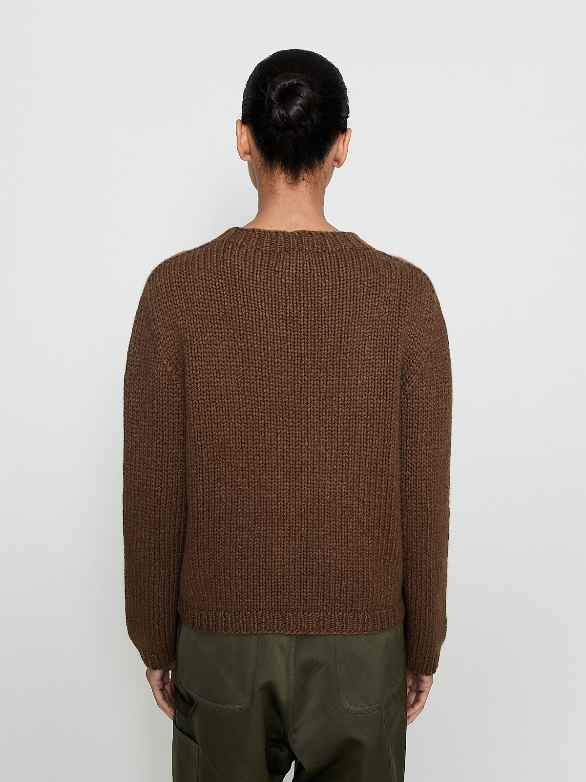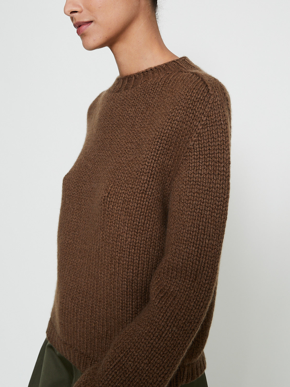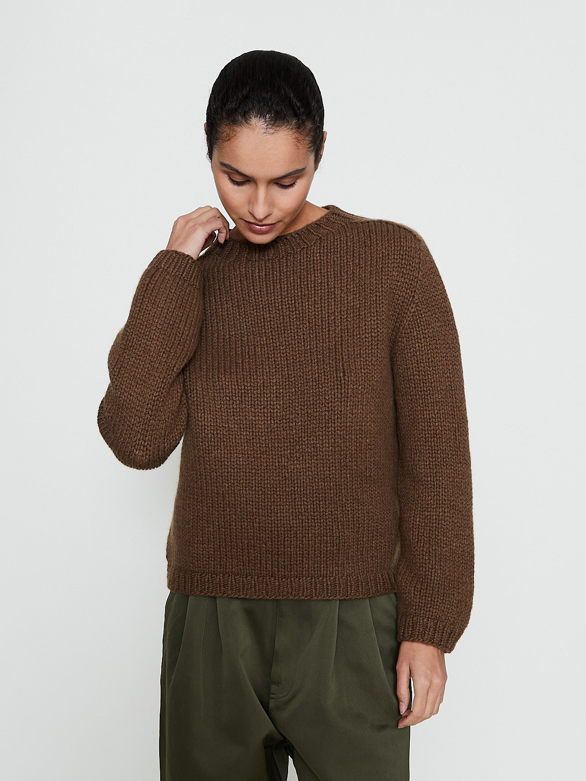 Handknitted sweater in brown cashmere. Round neckline and long sleeves with a fully fashioned shoulder. Features a rib detail around the neck, cuffs and bottom hem. Regular fit.