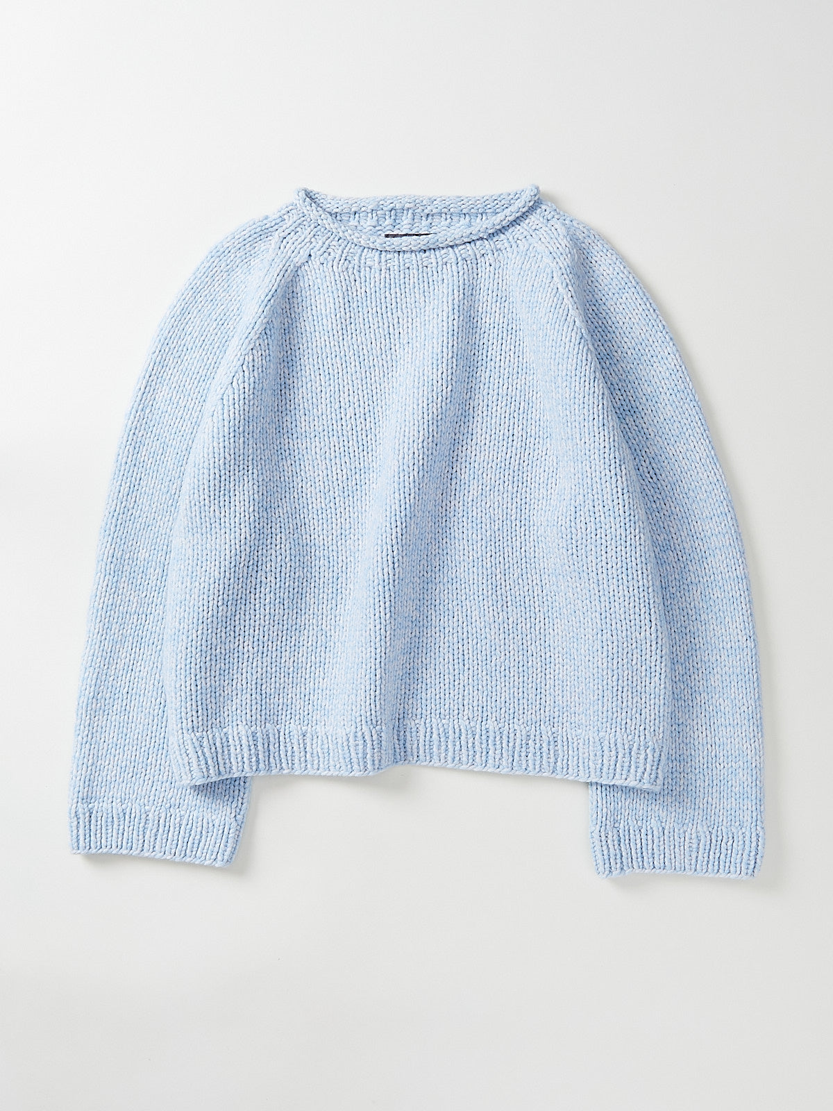 Handknitted sweater in two-toned light blue cashmere. Boatneck and long raglan sleeves. Features rib detail around the neck, cuffs and bottom hem. Relaxed and boxy fit.