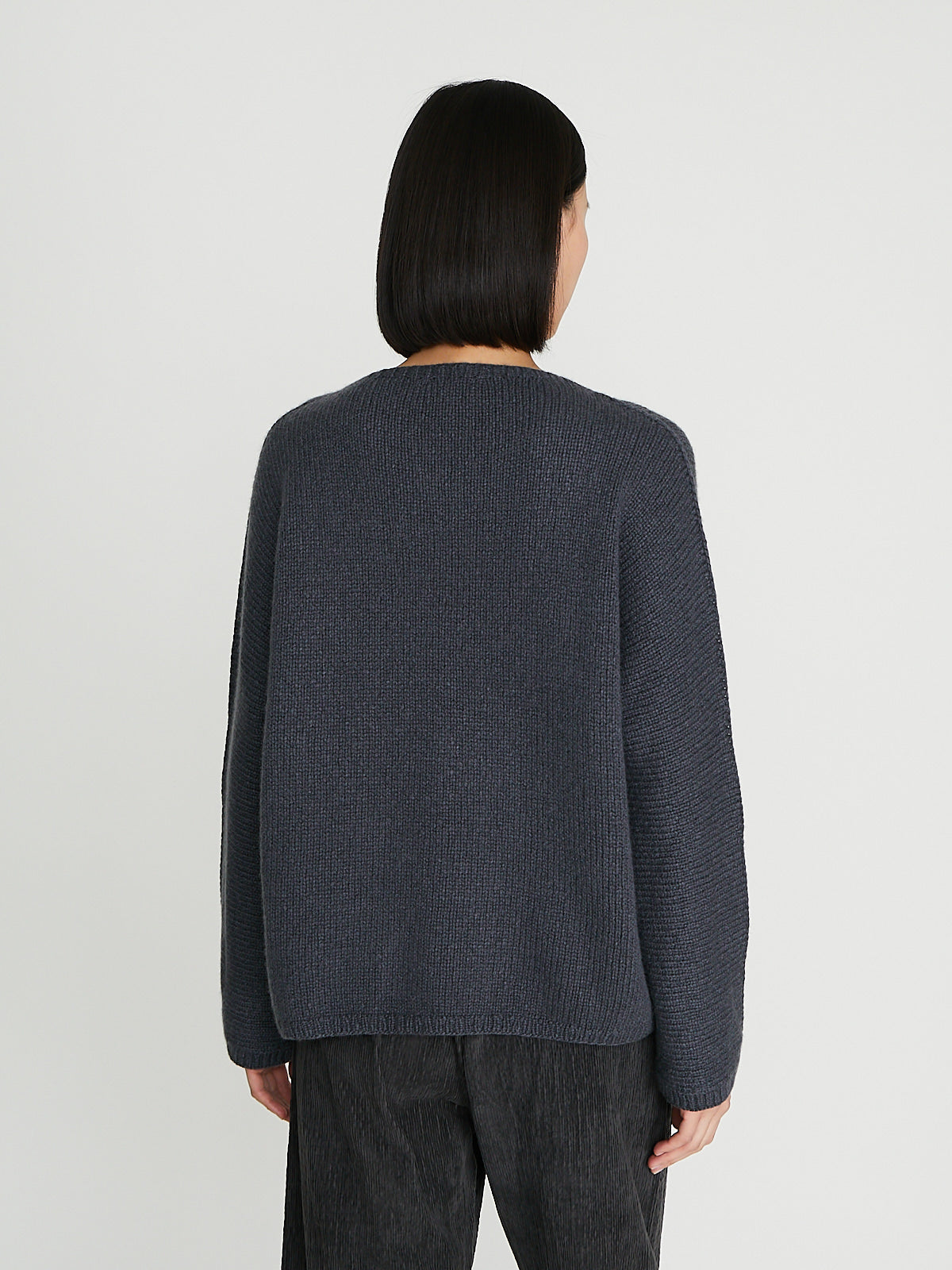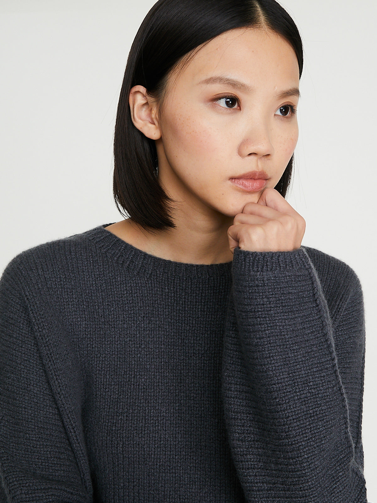Oversized handknitted sweater in grey cashmere. Crewneck and long raglan sleeves with an inside-out seam detail on the arms. Rib detail around the neck, cuffs and bottom hem.