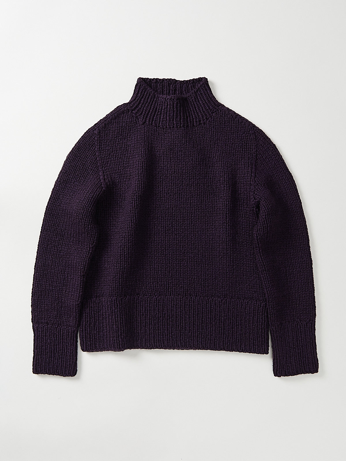 Handknitted chunky-knit sweater in burgundy cashmere. Mock turtleneck and a long sleeves with a fully fashioned shoulder. Slightly cropped. Wide rib detail around the neck, cuffs and bottom hem.