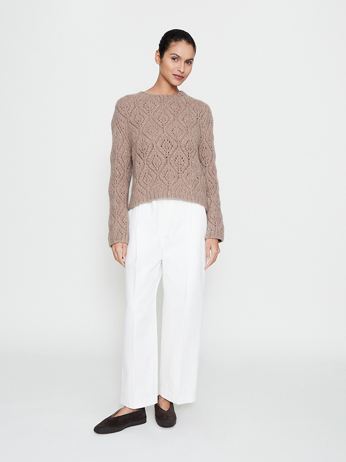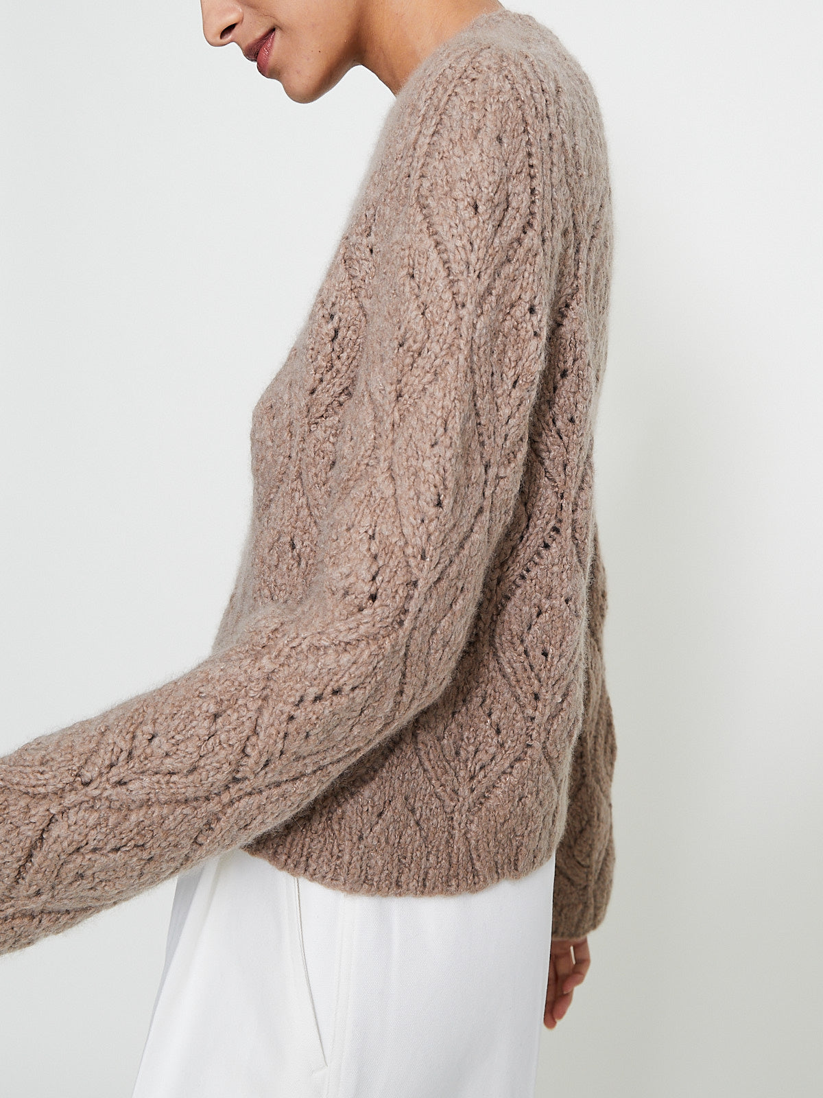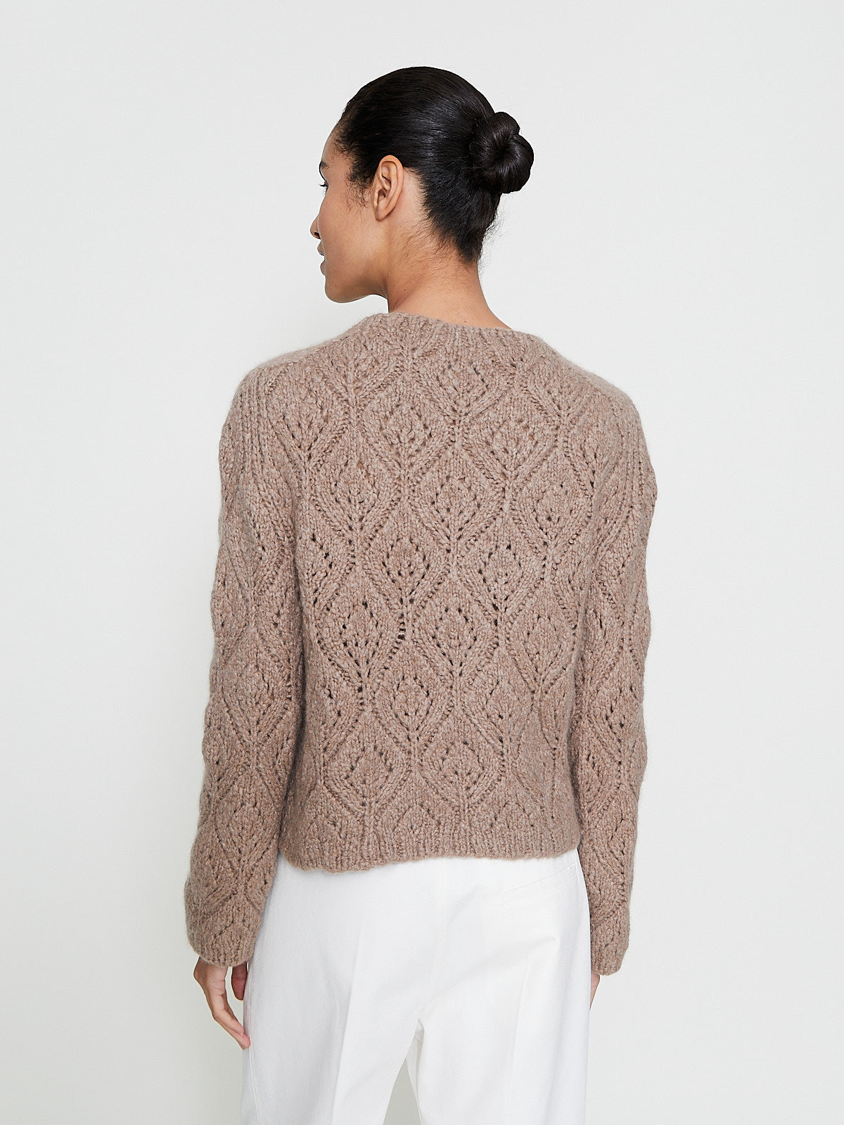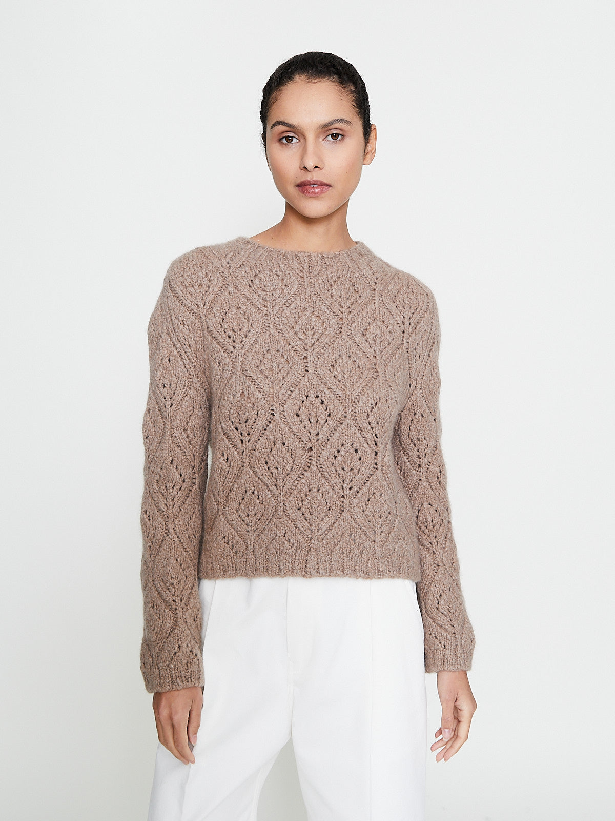 Handknitted sweater in caramel brown cashmere/silk with an overall triangular-like pattern. Round neckline and long sleeves with a subtle puff shoulder. Rib detail around the neck, cuffs and bottom hem. Regular fit.