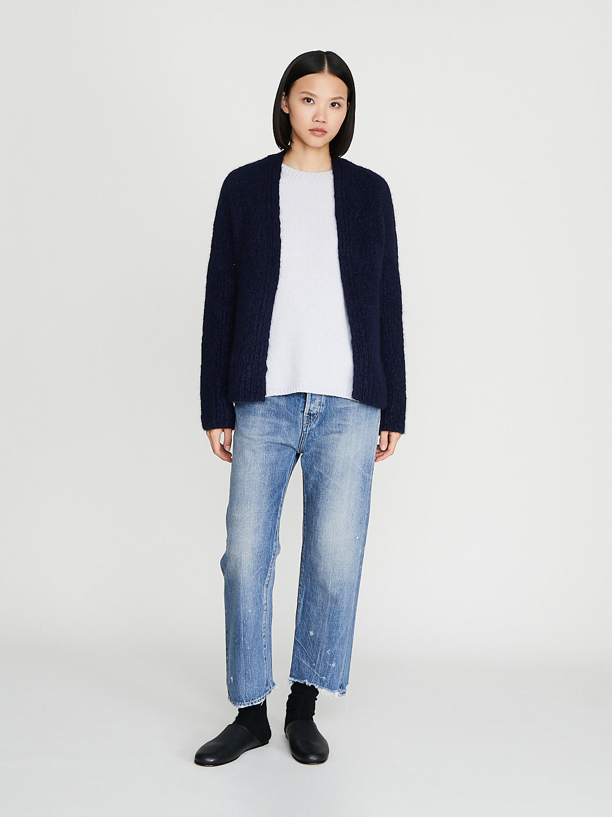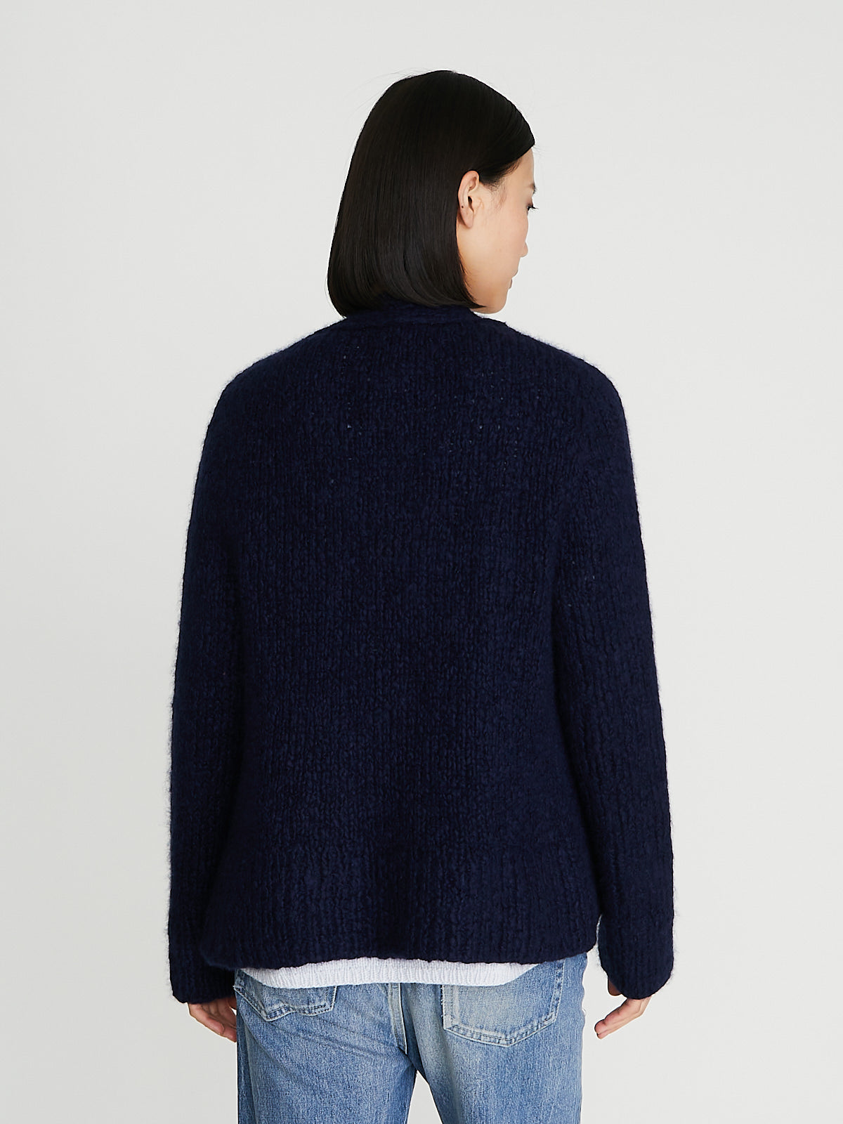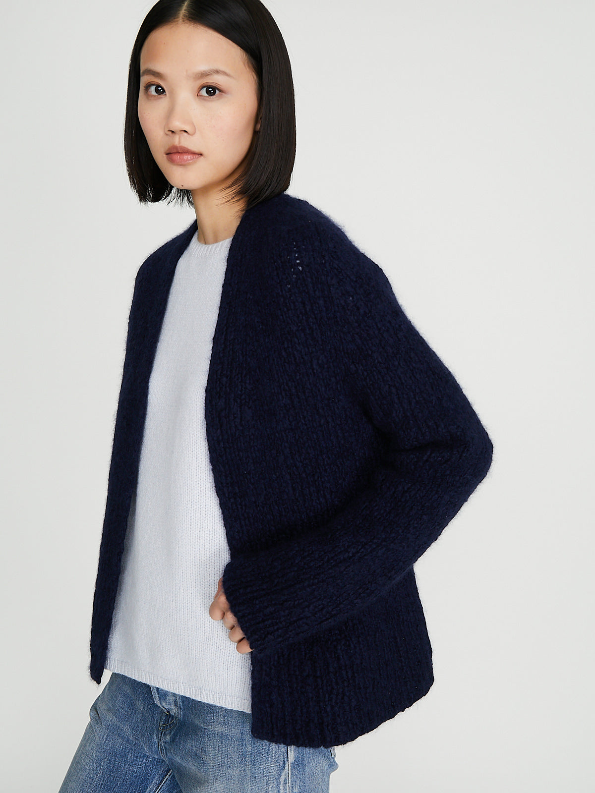 Handknitted boxy cardigan in midnight blue cashmere/silk. Open front and half raglan bracelet sleeves with a fully fashioned shoulder. Features a rib detail at the button placket, cuffs and bottom hem. Shrunken fit.