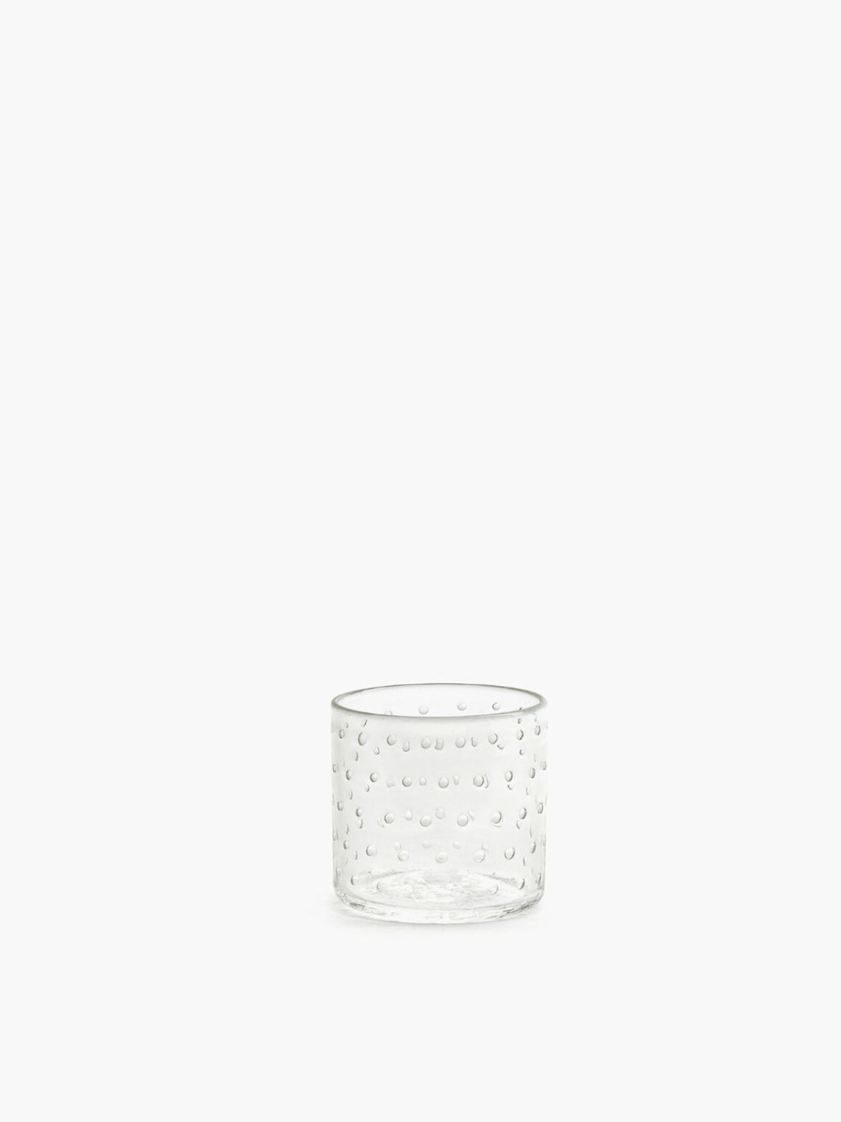 Mouthblown espresso cup in clear glass with a raindrop pattern. This cup utilised the historic bullicante technique, developed in Murano in the 1930s. This distinctive effect is achieved through a skilled and meticulous process that results in a captivating pattern of delicate air bubbles trapped within the glass.