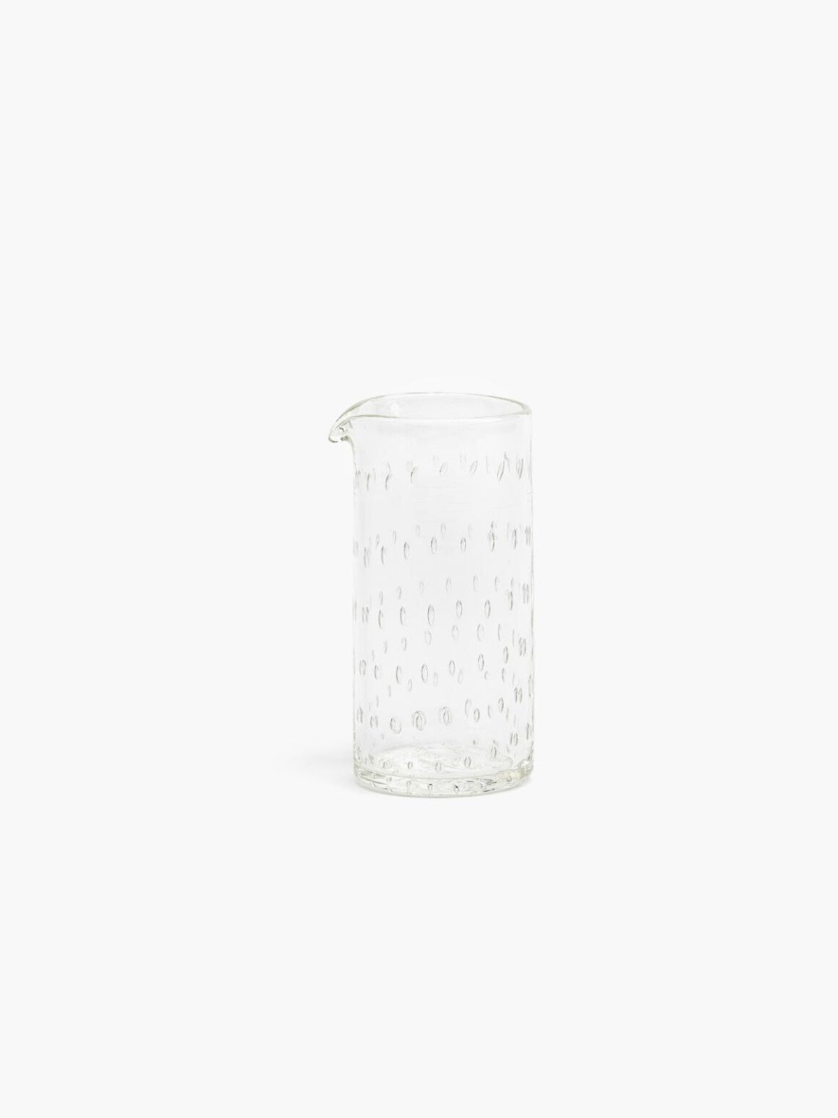 Mouthblown tiny jug in clear glass with a raindrop pattern. This jug utilises the historic bullicante technique, developed in Murano in the 1930s. This distinctive effect is achieved through a skilled and meticulous process that results in a captivating pattern of delicate air bubbles trapped within the glass.