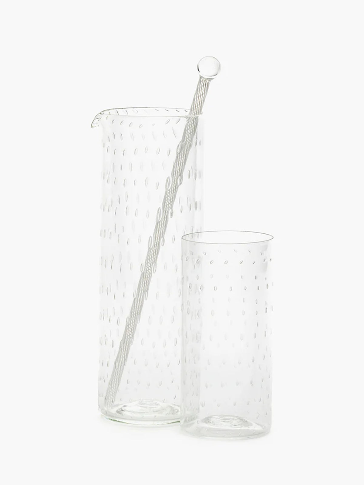 This tall, streamlined glass with its delicate bubbly pattern adds a sense of celebration to cocktails, juices, water and all large drinks.