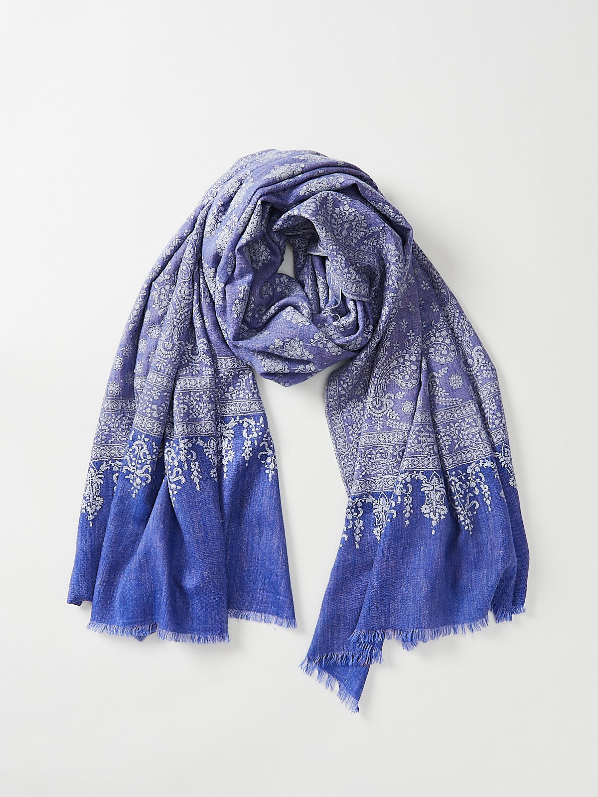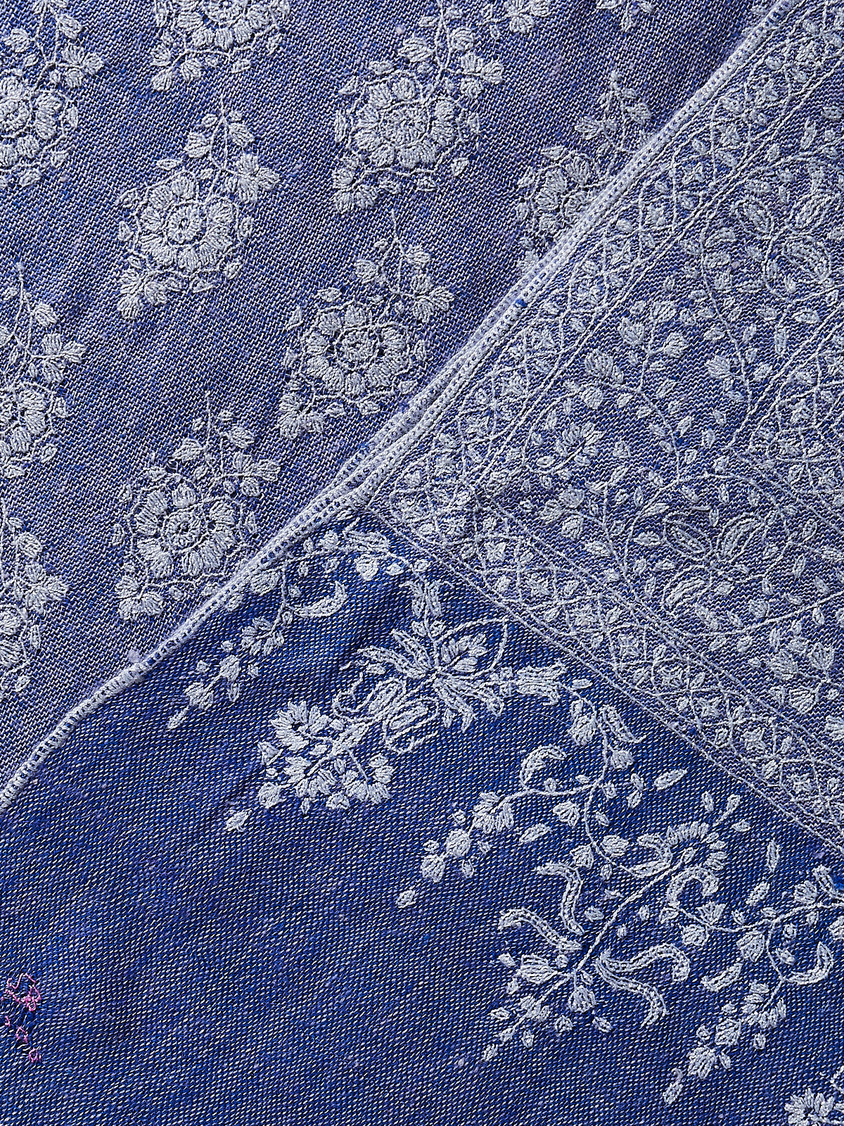 Embroidered Pashmina Shawl in Blue Chambray with White Embroideries