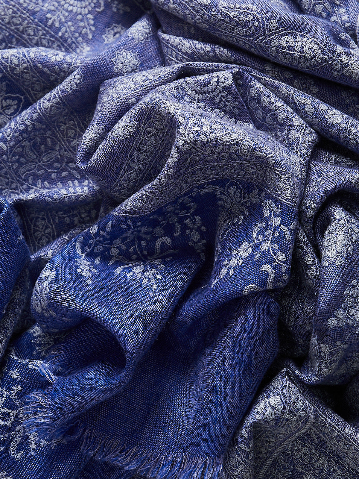 Handmade pashmina shawl in blue chambray cashmere with white floral embroidery. Every piece is a one of a kind and has a hand-stitched signature from the artisan.