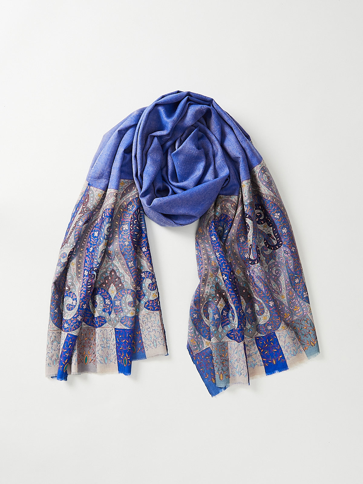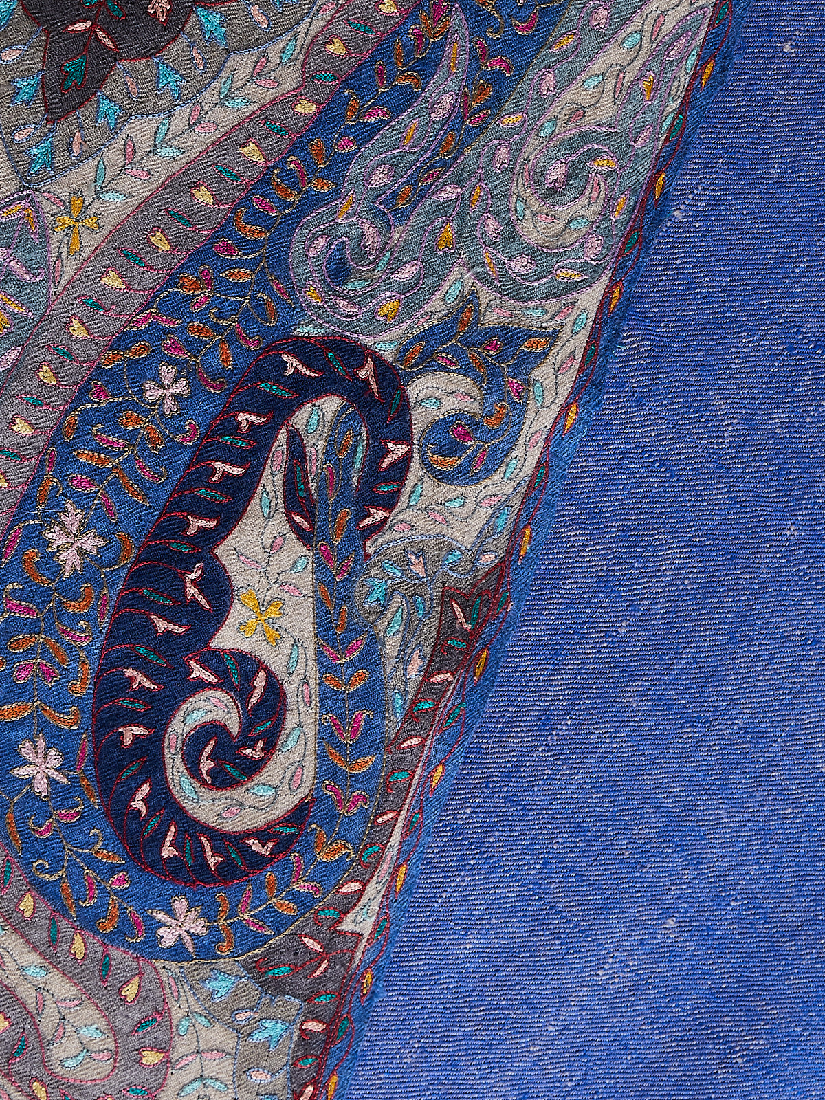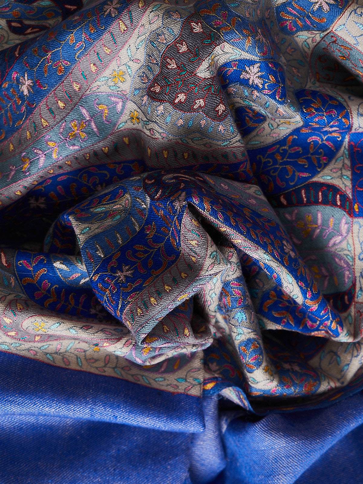 Handmade pashmina shawl in blue and cream cashmere with multicoloured floral embroidery. Every piece is a one of a kind and has a hand-stitched signature from the artisan.