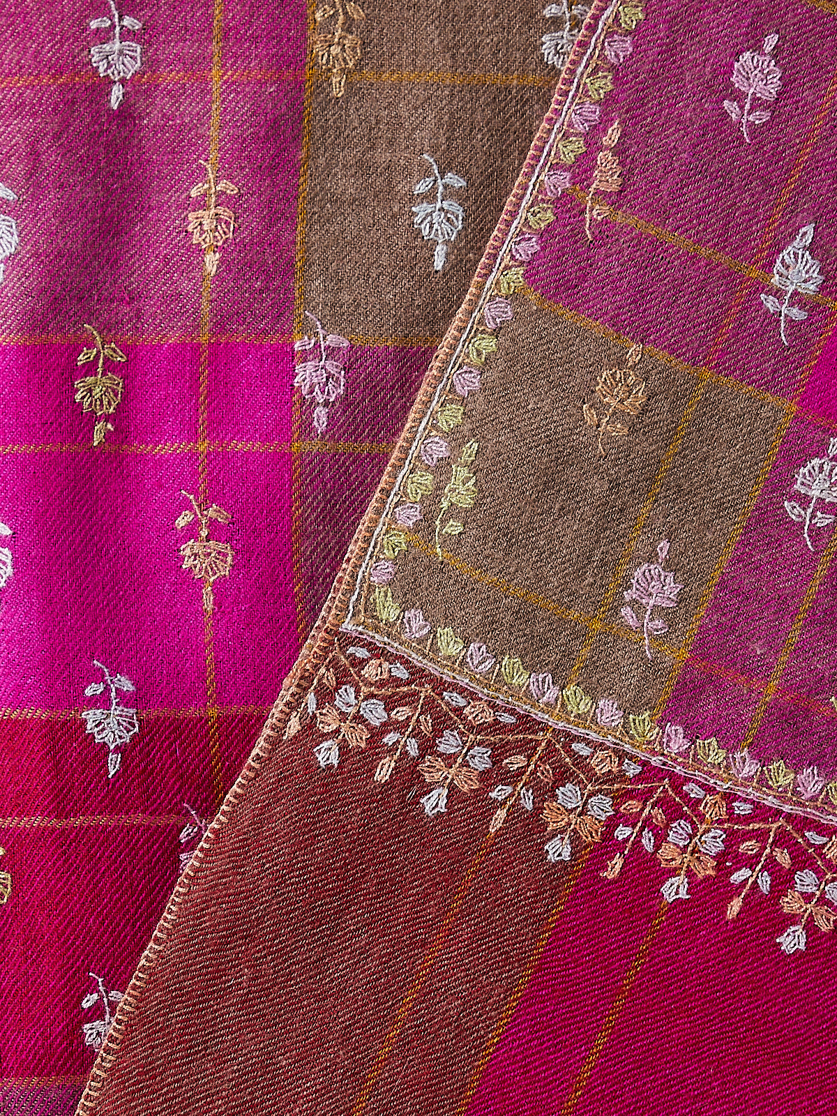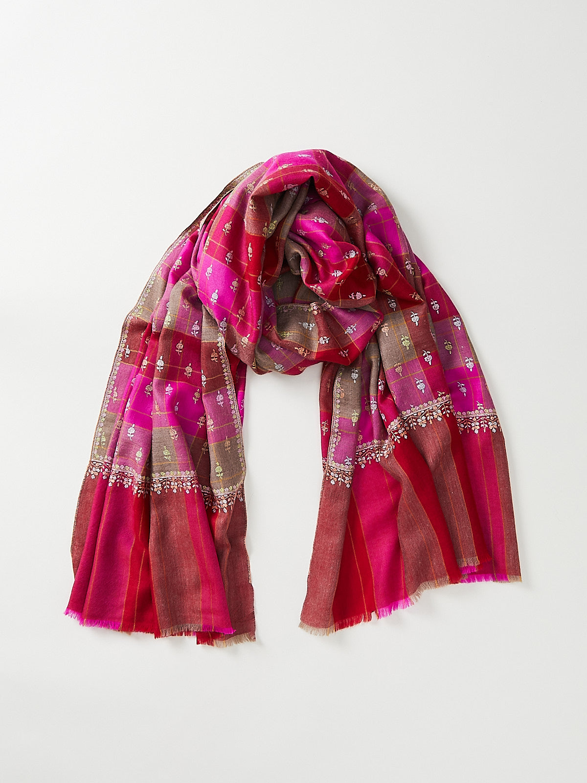 Handmade pashmina shawl in bold checked and striped fuchsia/red cashmere with pastel floral embroidery. Every piece is a one of a kind and has a hand-stitched signature from the artisan.