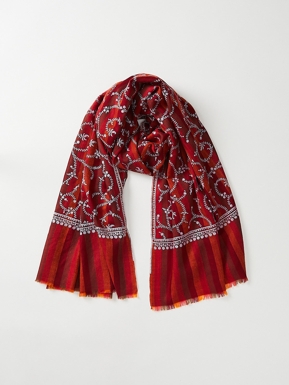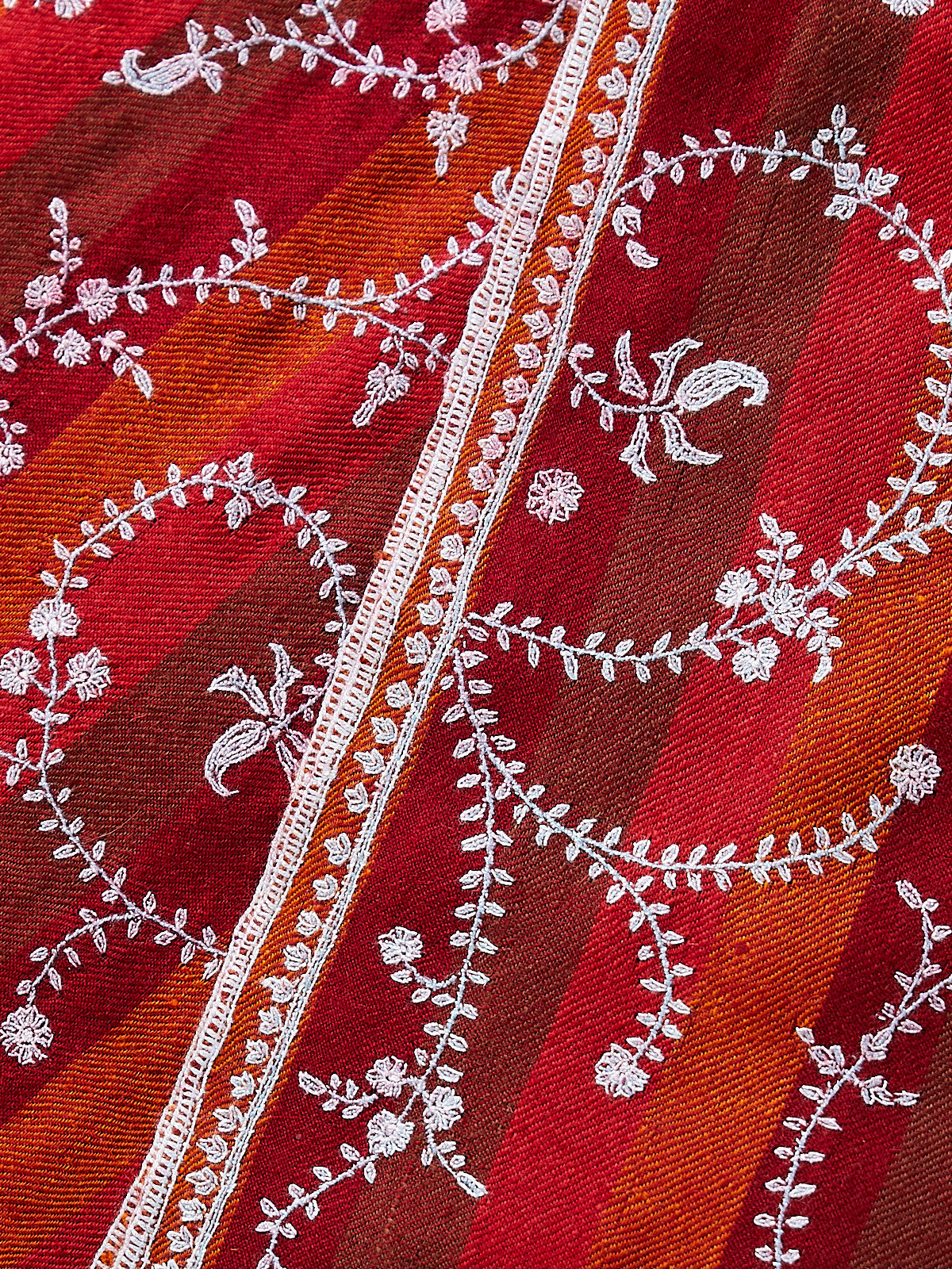 Handmade pashmina shawl in striped red cashmere with white floral embroidery. Every piece is a one of a kind and has a hand-stitched signature from the artisan.