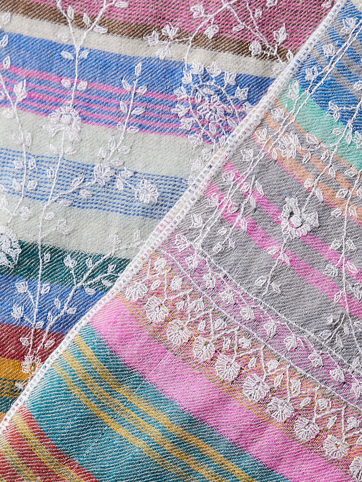 Handmade pashmina shawl in striped multicoloured cashmere with blush floral embroidery. Every piece is a one of a kind and has a hand-stitched signature from the artisan.