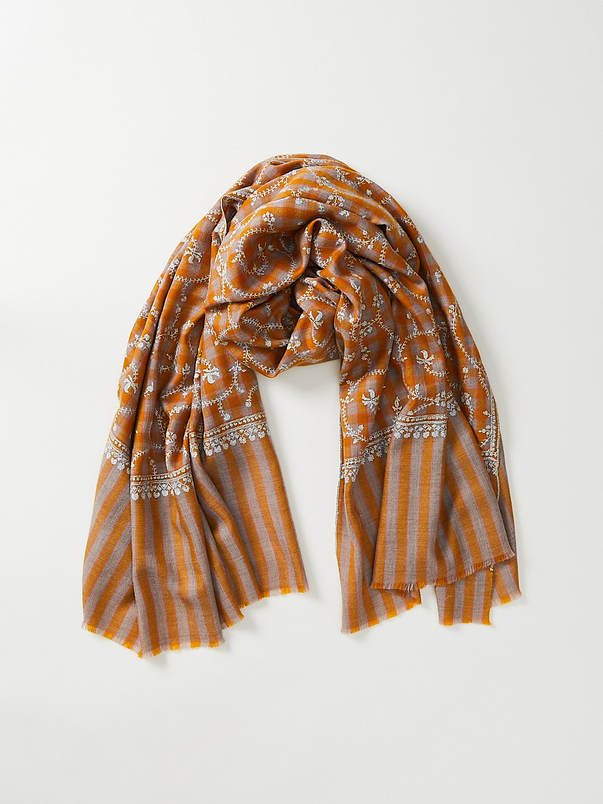 Handmade pashmina shawl in checked and striped turmeric/taupe/fuchsia cashmere with mint floral embroidery. Every piece is a one of a kind and has a hand-stitched signature from the artisan.