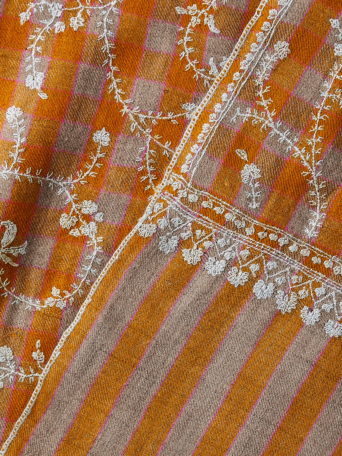 Embroidered Pashmina Shawl in Turmeric/Taupe, Fuchsia Check with Mint Embroideries